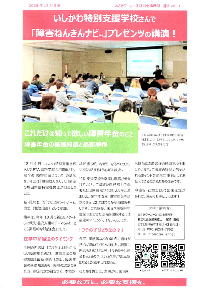 昨年12月、私がパートナー社労士として北陸三県を担当する「障害ねんきんナビ®」として、石川県内の特別支援学校でPTA・教職員むけの障害年金の学習会をさせていただきました。